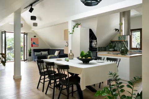 Jasno, nowocześnie i przytulnie. To 100-metrowe mieszkanie na poddaszu ze skosami urządzono funkcjonalnie i zgodnie z trendami