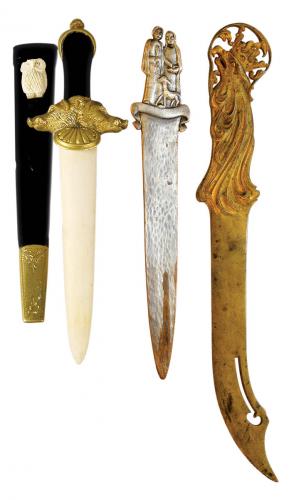 • Nóż cynowy z głową psa. Nóż w kształcie jamnika. Kordzik z rękojeścią w formie ptaka, 1. poł. XX w., DESA UNICUM.