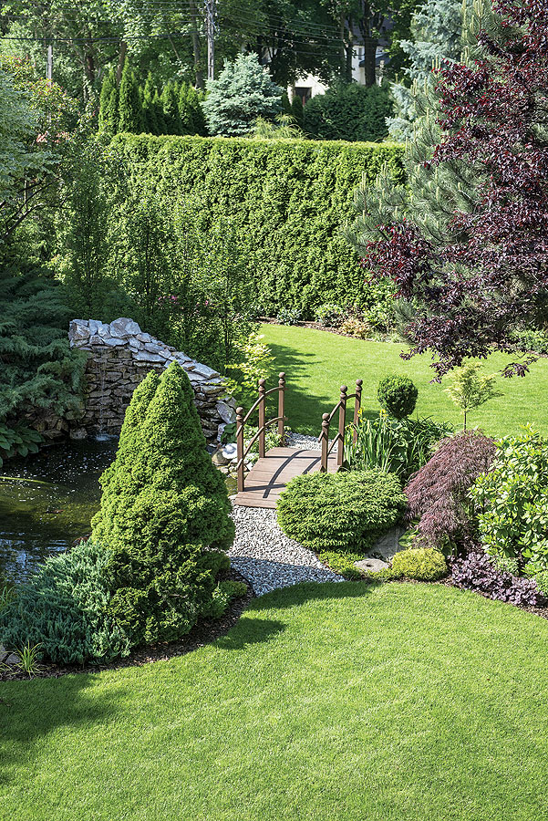 • Wodospad, zimozielone krzewy i drzewa, kompozycje w donicach.