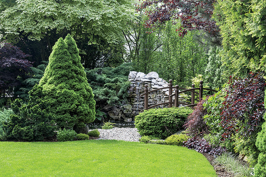 • Wodospad, zimozielone krzewy i drzewa, kompozycje w donicach.