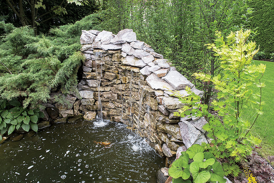Wodospad, zimozielone krzewy i drzewa, kompozycje w donicach.