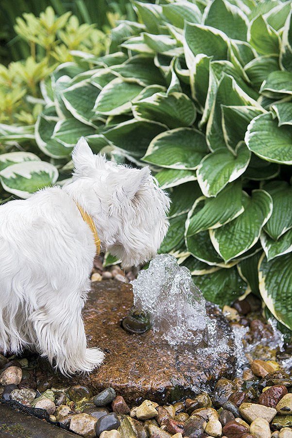 • Projektantka tego ogrodu naprawiała zieleń zniszczoną w czasie remontu domu: zbudowała wodospad, dosadziła zimozielone krzewy