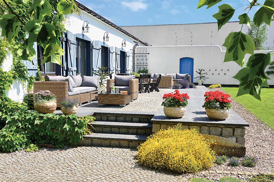 • amienne żarna, dawniej służące do mielenia zboża, zostały przerobione na donice dla jaskrawoczerwonych pelargonii.