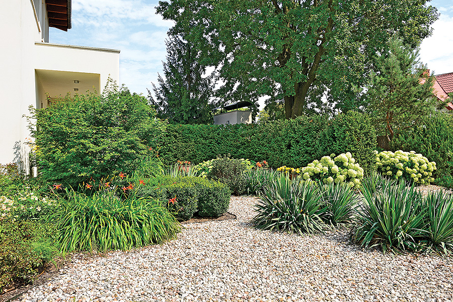 • Drzewa i krzewy przyjechały już duże. Kosić trzeba tylko trawnik, wszystko inne rośnie samo jak na drożdżach. Oto ogród