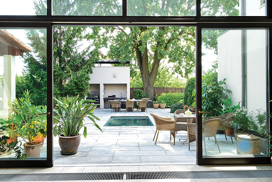 Gdy projektanci zaproponowali gospodarzowi, żeby pośrodku tarasu urządzić kamienny staw, nie był przekonany, bo to ani basen, ani oczko wodne, ale zgodził się. Dziś jadalnia pod chmurką jest ulubionym miejscem domowników i gości.
