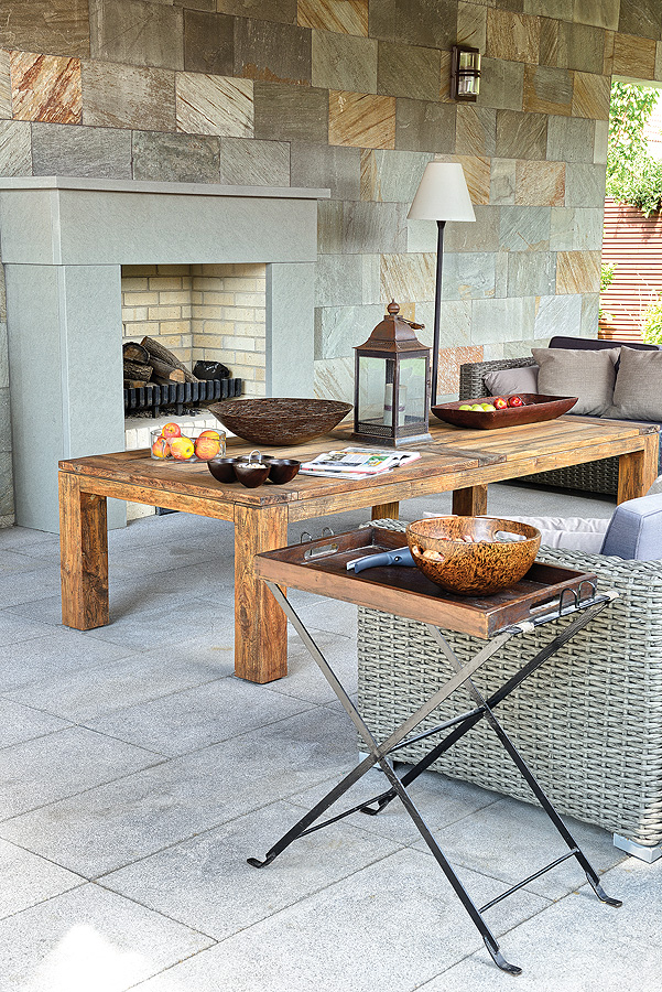 • W ogrodzie po jedzeniu, podobnie jak w domu, można sie przenieść do salonu z leżankami, kanapą i kominkiem.