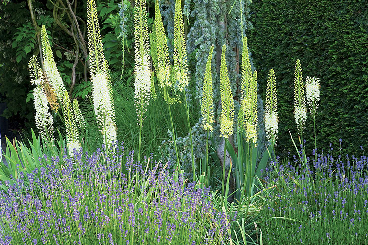• Murawa, ścieżki wysypane żwirem lub wyłożone otoczakami, przycięte w kule bukszpany, barwne kępy ostróżek.