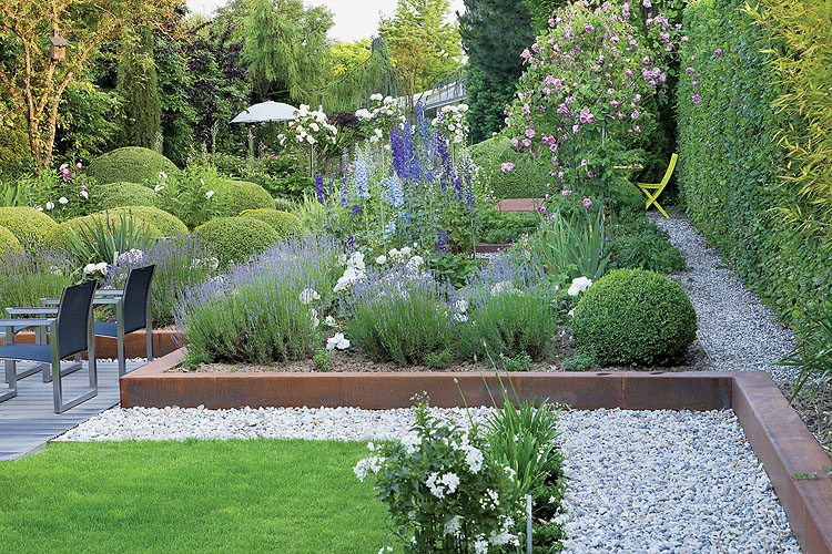 • Tradycyjne rośliny, jak bukszpany i róże, połączone są z nowoczesną architekturą. Stąd stalowe elementy i chromowane donice.