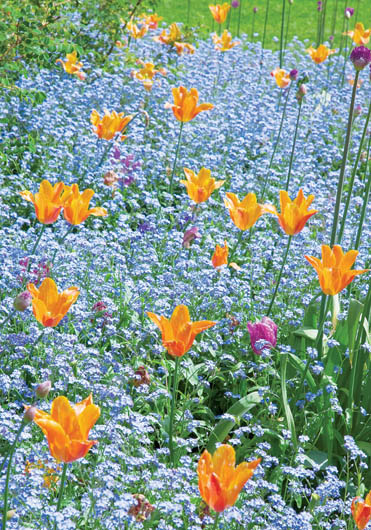• Między niezapominajkami wyrastają tulipany.