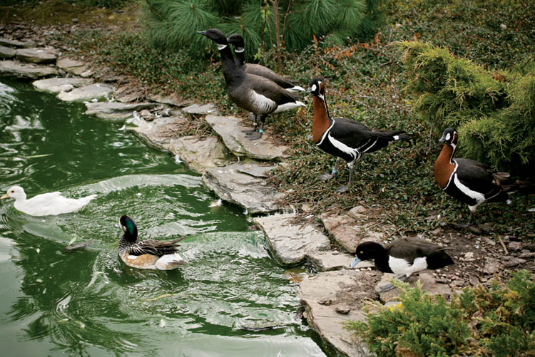 • Po stawie pływają różne gatunki kaczek i gęsi (kaczki czernice, bernikle rdzawoszyje i obrożne).