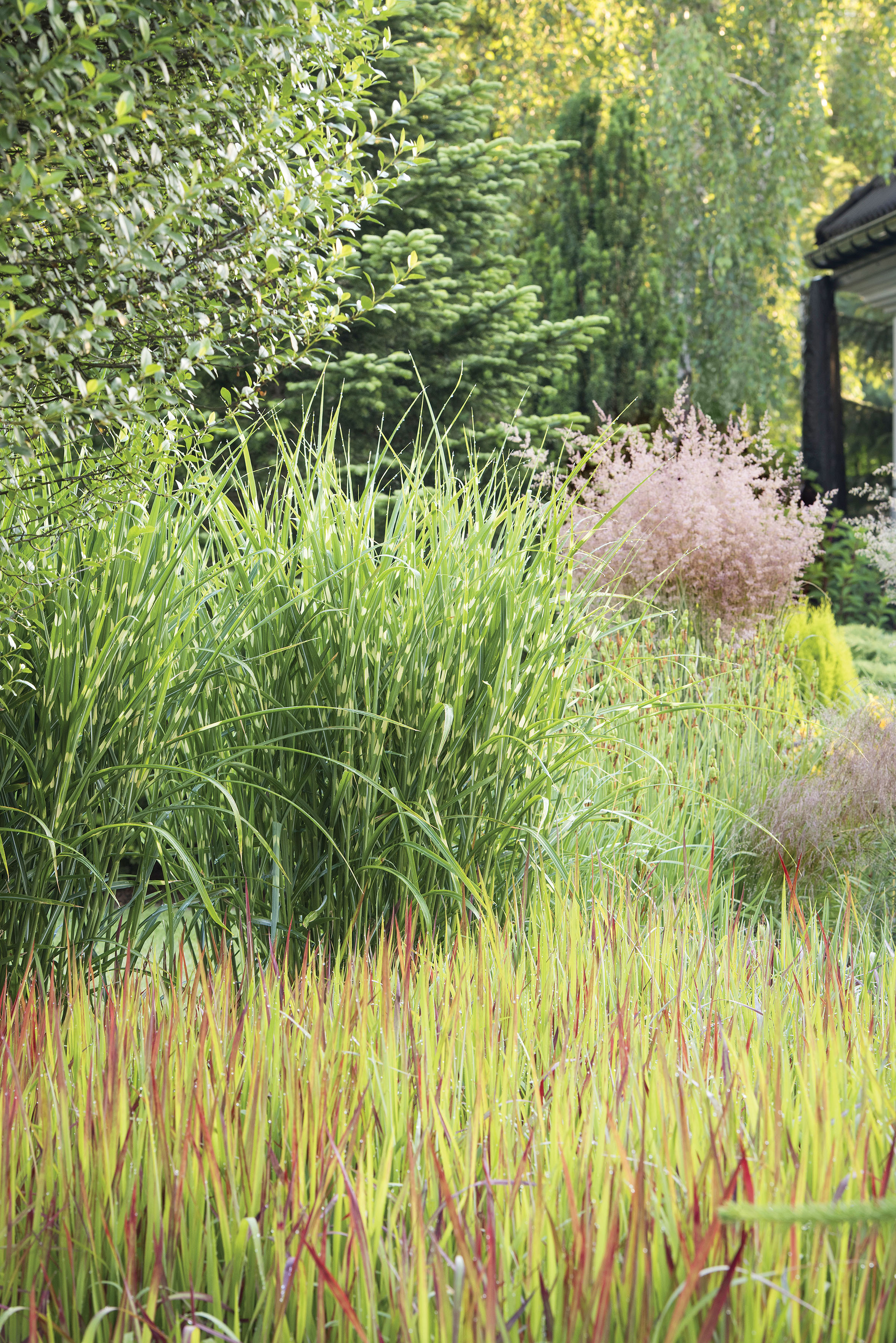 Widok z okien na ogród każdego dnia zaskakuje czymś innym. Końcówka lata należy do traw, które tworzą malowniczą ścianę zieleni. Wtóruje im ‘Leonardo da Vinci’, róża o stu płatkach.