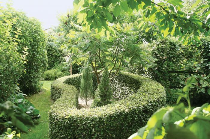 W "misie" ze strzyżonego grabu rośnie jałowiec 'Skyrocket', tuja i sumak octowiec.