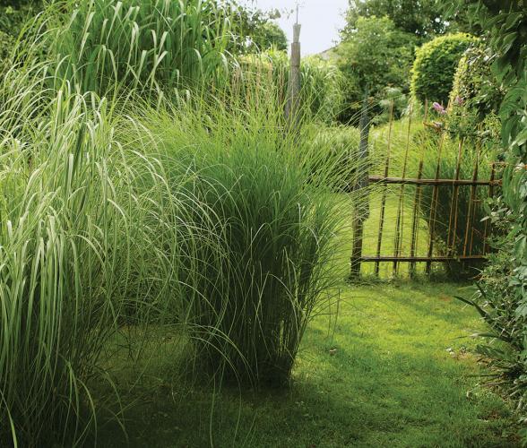 • Niski żywopłot to winobluszcz, zza niego wygląda ogromny miskant.