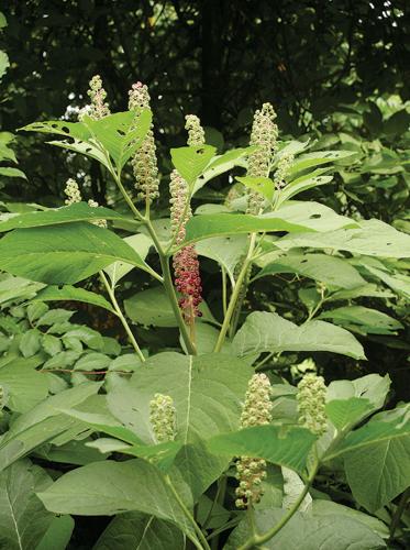 • Za otwartą bramką obrośniętą biało-zieloną trzmieliną, widać dorodne liście lepiężników.