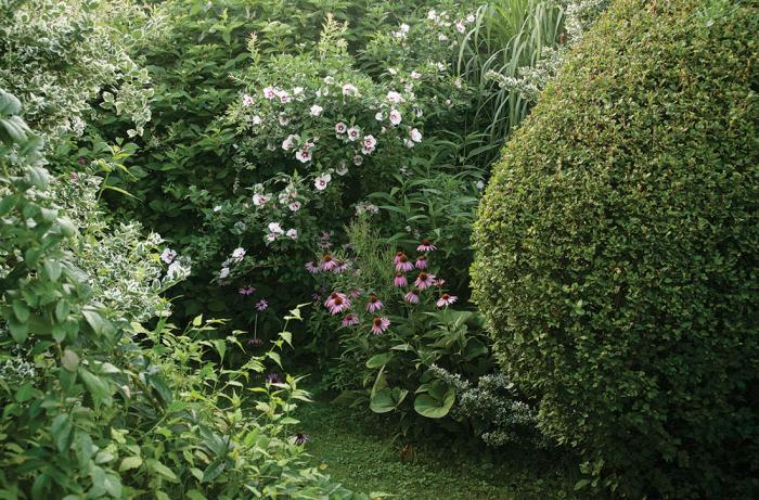 • Ketmia syryjska i jeżówka. Ogród pełen traw i żywopłotów