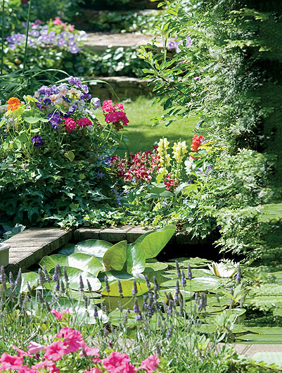 • Ptaki przy oczku wodnym. Ogród w angielskim stylu