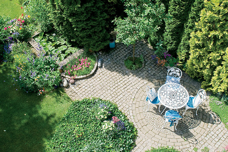 • Gospodyni najbardziej lubi rośliny kwitnące w zimnych barwach, więc w ogrodzie dominują biel, fiolet, błękit i róż.