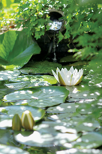 • Ptaki przy oczku wodnym. Ogród w angielskim stylu