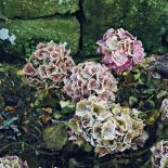 • Lekko oszronione kwiaty hortensji. Ogród w zimowej szacie