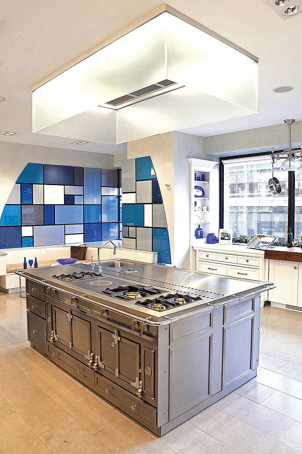 Okap kuchenny jak lampa, osłonięty szklanymi panelami, LA CORNUE,