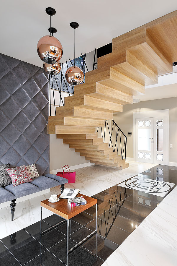 Nowoczesna aranżacja. Nad schodami trzy lampki sufitowe (plafony) z De Majo.