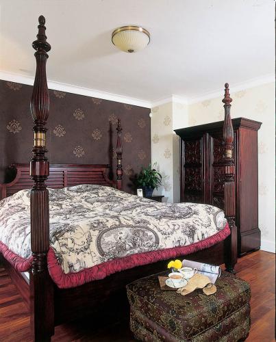 Inspirowane Orientem łóżko z kolumienkami i rzeźbiona szafa nadają sypialni kolonialny styl.