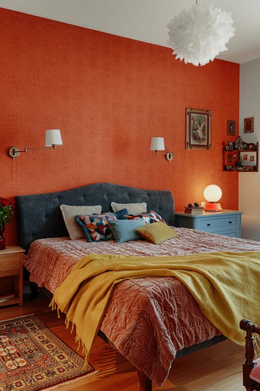 sypialnia w żywych kolorach jak z filmu Almodovara