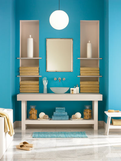 • Wystarczy jedna ściana w tym kolorze, by poranna toaleta przypominała o błękicie letniego nieba. Fot. Beckers.