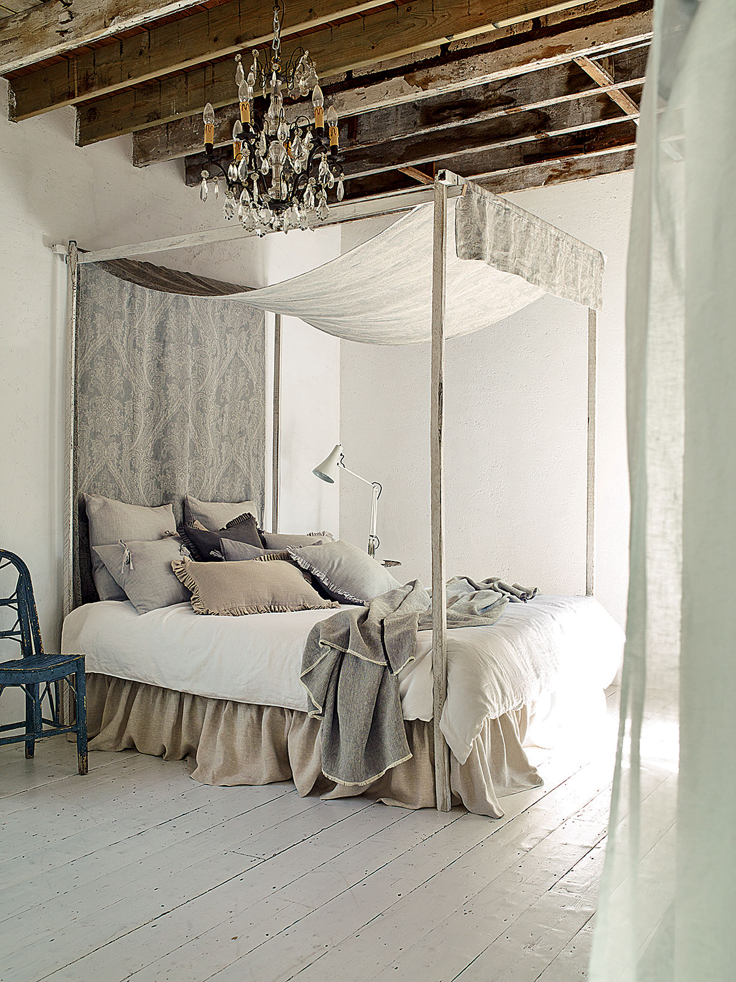 Damaris, lniana pościel, uszyta z tkaniny Cellini, za 394 zł/m, baldachim – 648 zł/m, Romo, decodore.pl
