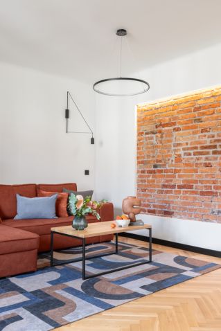 jadalnia z czerwoną cegłą i drewnem na ścianie