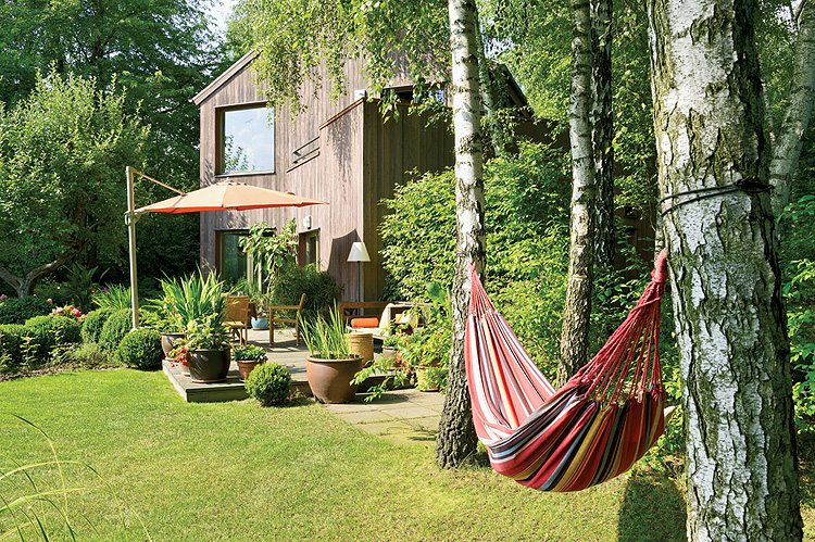 Nowy dom i ogród powstały obok starej jabłonki i brzozowego zagajnika. Modrzewiowe ściany przypominają burty żaglowca, który sunie przez ocean zieleni. Można nim „opłynąć” bez paszportu i wizy kulę ziemską.