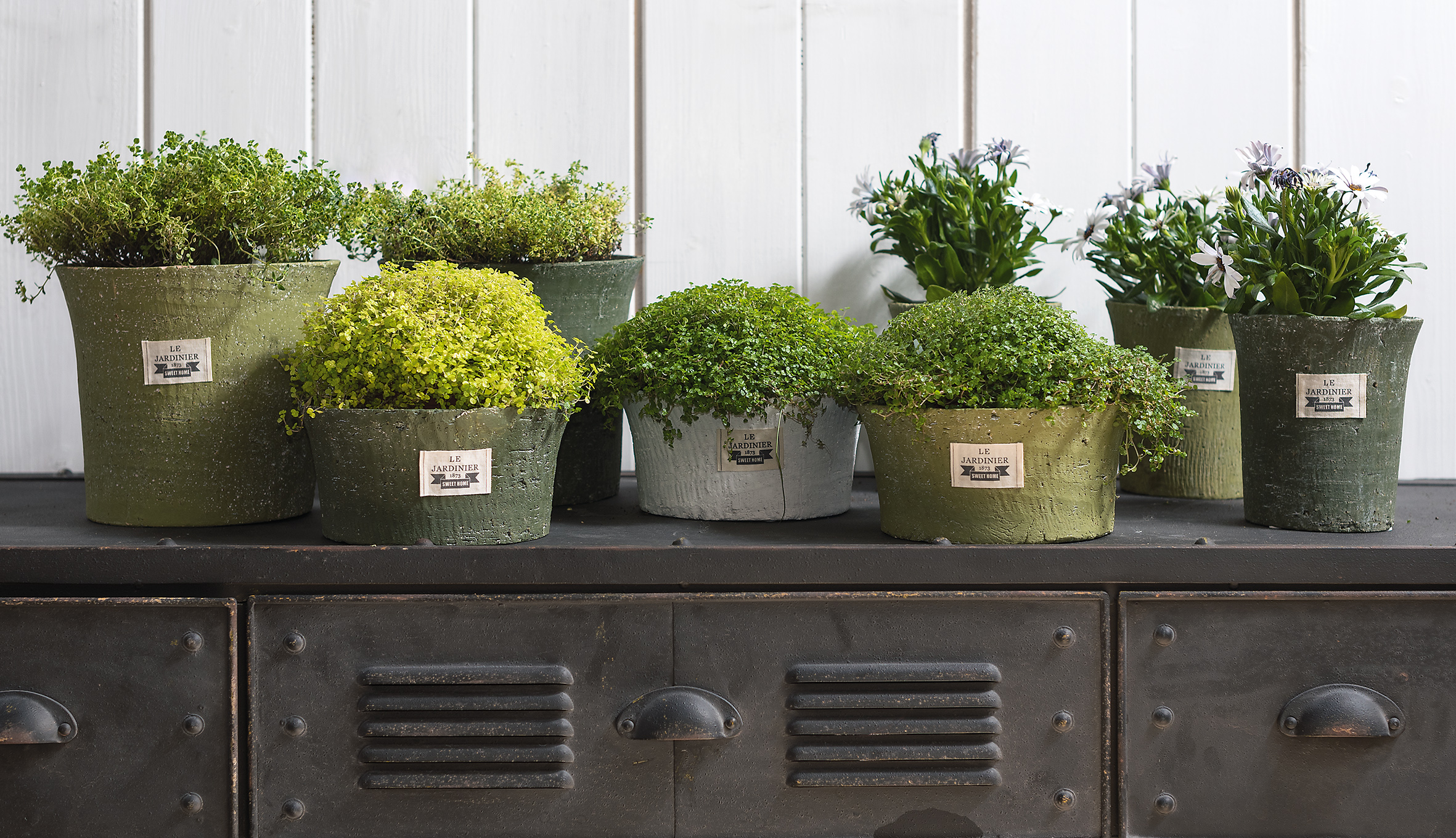 • Doniczki ze stylizowanej i specjalnie postarzanej ceramiki nazwiązują do wielkich donic ogrodowych z francuskich willi.