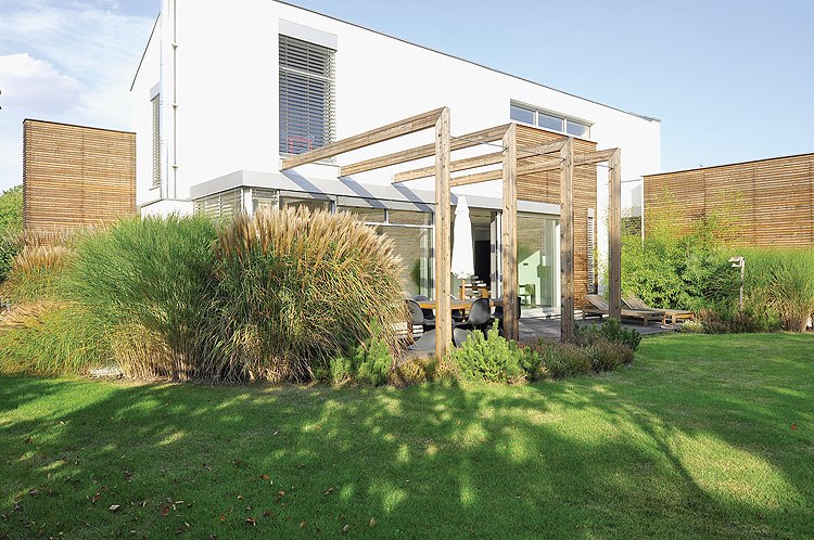 Przyroda sama zdecydowała, co ma tu rosnąć. Ewa posadziła drzewa, ale wszystkie uschły. Trawy za to przyjęły się znakomicie. Kiedy architektka Ewa Stryczek-Smolakowska projektowała swój dom, już myślała o tym, co będzie dookoła. Nie chciała czekać kilka lat na zieleń za przeszkloną ścianą salonu – to po pierwsze. Po drugie – dla niej dom i ogród to całość. Stąd jeden styl dla tego, co wewnątrz i na zewnątrz. Wszystko proste, czyste i nowoczesne. – Działka jest