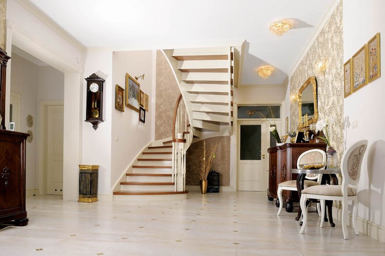 Schody angielskie - białe z mahoniową balustradą. SCHODY WŁODARCZYK
