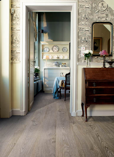 Elite - podłoga z jasnoszarych matowych dębowych desek. QUICK STEP