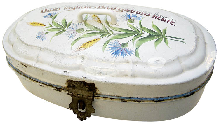 • Stalowy, emaliowany pojemnik z napisem (w tłumaczeniu na polski) ?Chleba naszego powszedniego daj nam dzisiaj?),