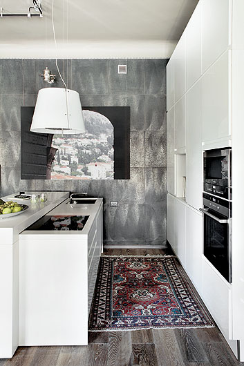 Wyspa z wysówaną płytą i zlewem, a także okam-lampa są ze studia Asymetria. Metalowe płyty na ścianę projektantka znalazła