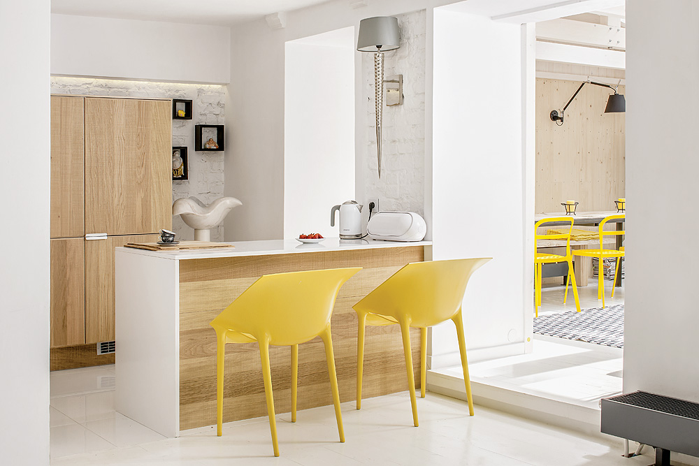 Kuchnia choć mała jest wielką dumą projektantki. Drewniane szafy mieszcza wszystko co trzeba, nawet... pralkę.