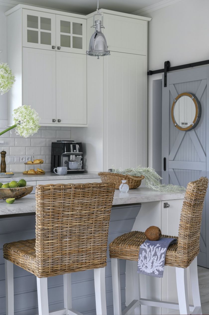 Letni dom w stylu hamptons nad Bałtykiem – wnętrza urządzone w marynistycznych kolorach: błękitach, bieli i szarości