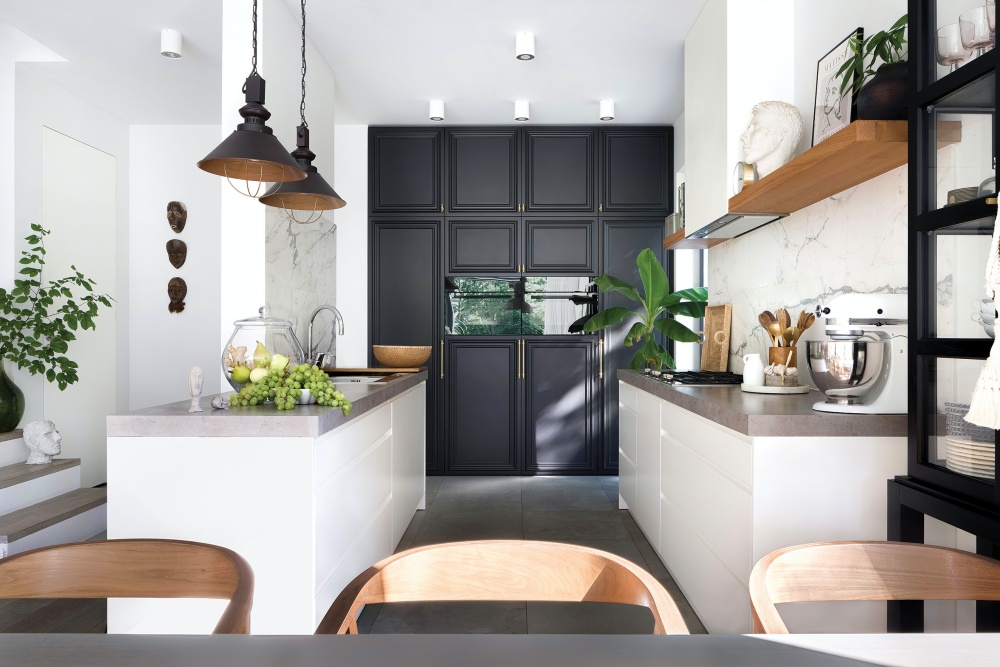 Dom w idealnej równowadze – przytulne czarno-białe wnętrza ocieplone drewnem oraz zielenią