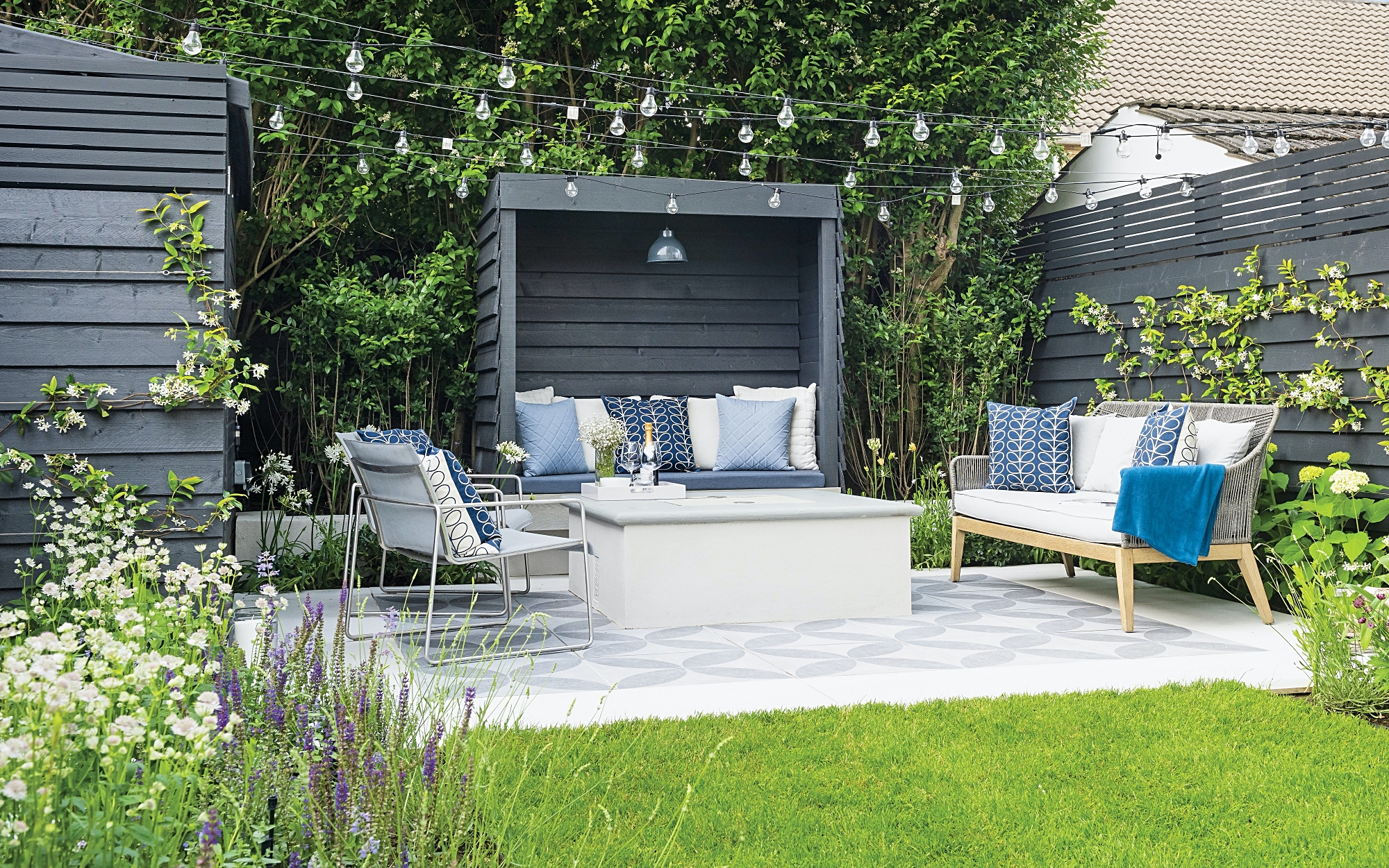 Mały przydomowy ogród z paleniskiem – kolorami roślin i małej architektury nawiązuje do wnętrz