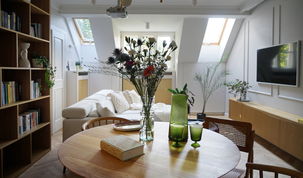 Stylowy miks rozwiązań i kolorów – aranżacja 70-metrowego mieszkania na poddaszu w warszawskiej kamienicy