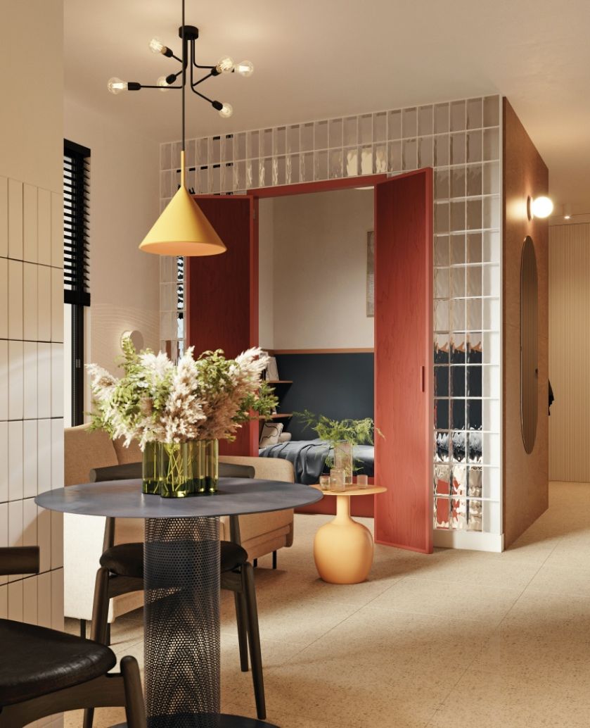 Zapomniane przez dekady luksfery powracają do łask. Przykładem jest ta przemyślnie zaprojektowana 33-metrowa kawalerka, w której dzięki szklanym bloczkom, udało się efektownie wydzielić sypialnię i dobrze ją doświetlić.
