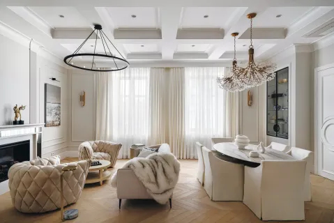 Szykowny azyl – elegancki i kobiecy apartament w stylu modern classic z tapetą na suficie