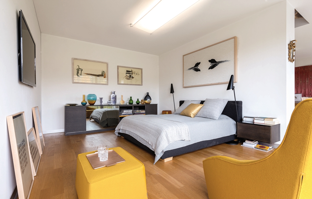 W sypialni na komodzie szkło Zbigniewa Horbowego, praca Stephanie Syjuco oraz wazony z krośnieńskiej huty Makora.