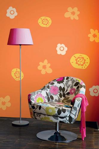 Kolor Sunset z kolekcji farb Designer Väggfärg Hel Matt, cena - 52 zł/2,5 l. Kwiaty namalowano przy pomocy szablonów. BECKERS