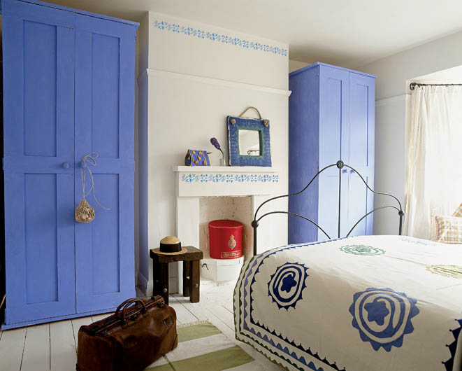 Ten szlaczek został przywieziony z podróży. Pomysł ściągnęliśmy z portugalskich płytek ceramicznych azulejos, którymi od XVI wieku wykłada się domy, ściany i podłogi. Współczesne wzory mają różne kolory. My jednak proponujemy tradycyjny motyw – niebieski, ale w trzech odcieniach. Głęboki śródziemnomorski błękit, jego jaśniejszy odcień i delikatny turkus wniosą trochę lata w środku zimy. Freskami ozdobimy obudowę kominka, szafkę lub abażur. Dobrze, jeżeli nie b