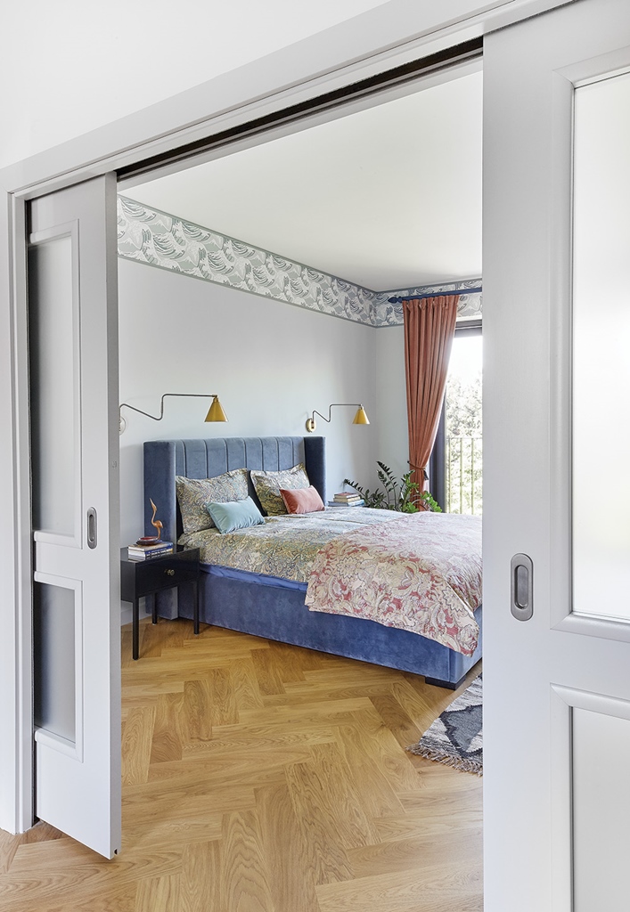 • Przesuwne, stylowe drzwi między sypialnią a garderobą odtworzono na wzór oryginalnych. Gdy połączono je z