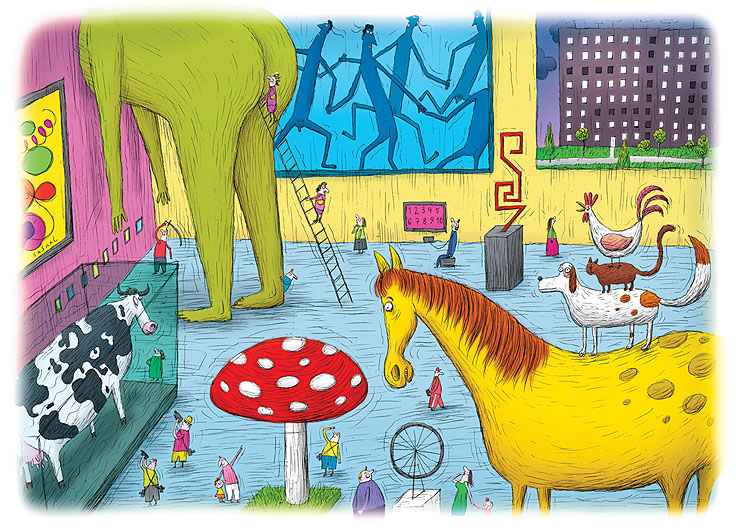 Groteska, humor raczej czarny i magiczna sceneria. Prace Piotra Sochy są jak rysunki dla dzieci, które bawią rodziców. W pracowni Piotra Sochy (apartamentowiec w centrum stolicy) nie ma cienia artystycznego bałaganu. Żadnych ołówków, rapidografów, kartonów. Na sterylnym biurku miga jedynie monitor komputera, a na nim prawie skończona praca – wymagający nauczyciel (widać to po surducie i poważnej minie), który uczy trudnych s