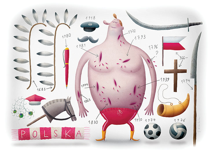 Groteska, humor raczej czarny i magiczna sceneria. Prace Piotra Sochy są jak rysunki dla dzieci, które bawią rodziców. W pracowni Piotra Sochy (apartamentowiec w centrum stolicy) nie ma cienia artystycznego bałaganu. Żadnych ołówków, rapidografów, kartonów. Na sterylnym biurku miga jedynie monitor komputera, a na nim prawie skończona praca – wymagający nauczyciel (widać to po surducie i poważnej minie), który uczy trudnych s